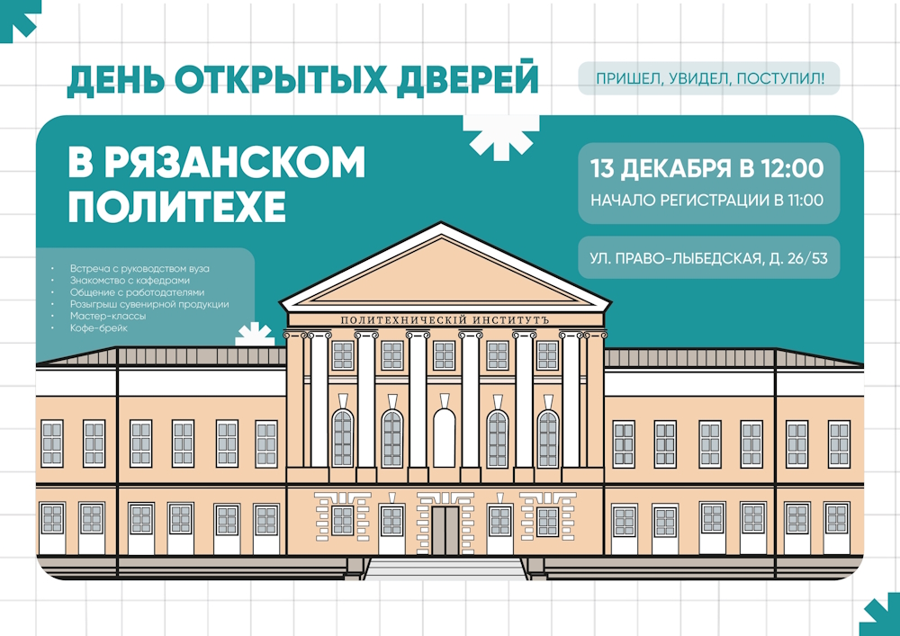 Приглашаем вас на День открытых дверей Рязанского Политеха. Он состоится в субботу, 13 декабря, в 12:00.