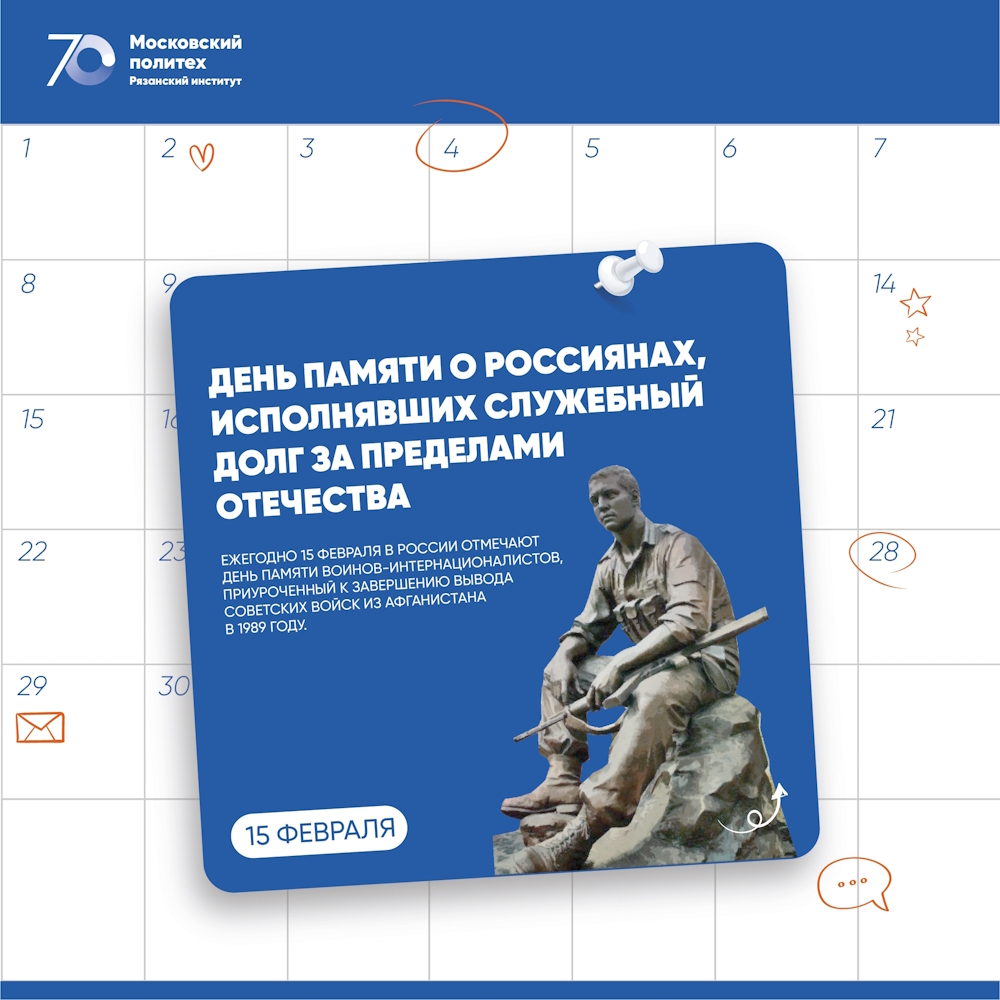 15 февраля в России отмечается День памяти о россиянах, исполнявших служебный долг за пределами Отечества - Рязанский институт (филиал) Московского политехнического университета 15 февраля в России отмечается День памяти о россиянах, исполнявших служебный долг за пределами Отечества - Рязанский институт (филиал) Московского политехнического университета