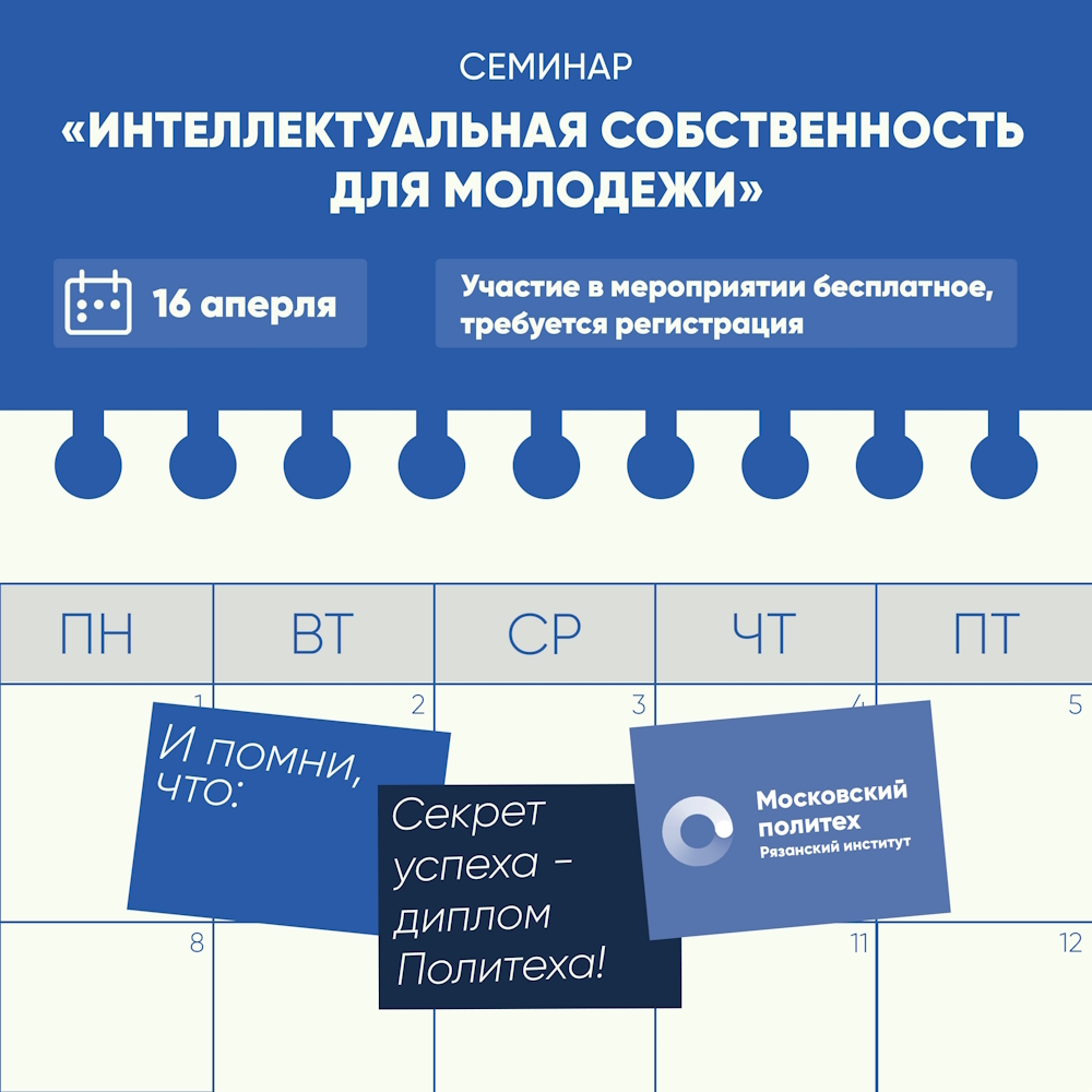 16 апреля 2026 года на базе Рязанского института (филиала) Московского политехнического университета состоится семинар “Интеллектуальная собственность для молодежи”. Мероприятие пройдет по адресу: ул. Право-Лыбедская, 26/53.