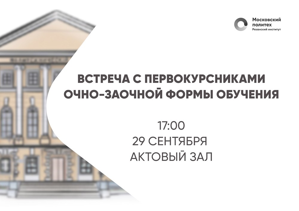 Напоминаем вам, что уже скоро состоится обязательная встреча студентов очно-заочной формы обучения (бакалавриат, специалитет, магистратура) с руководством вуза. Собрание пройдет в Актовом зале в Главном корпусе Рязанского политехнического института (ул. Право-Лыбедская, д. 26/53).