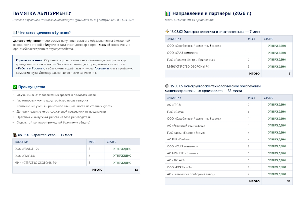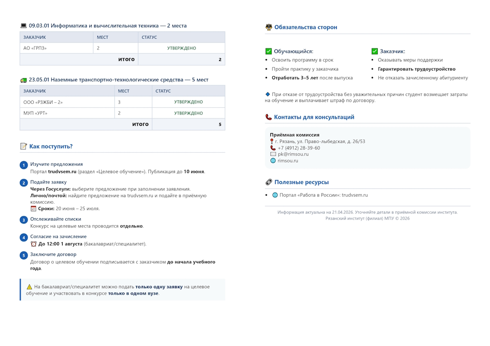 Приёмная комиссия Рязанского института (филиала) Московского политехнического университета информирует абитуриентов о старте приёма заявок на целевое обучение в 2026 году.