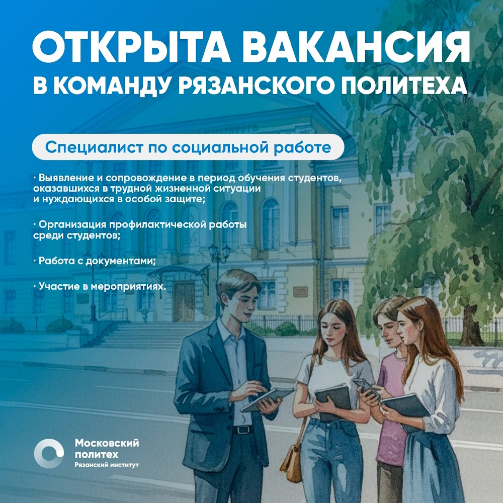 Рязанский институт (филиал) Московского политехнического университета ищет специалиста по социальной работе с молодежью.