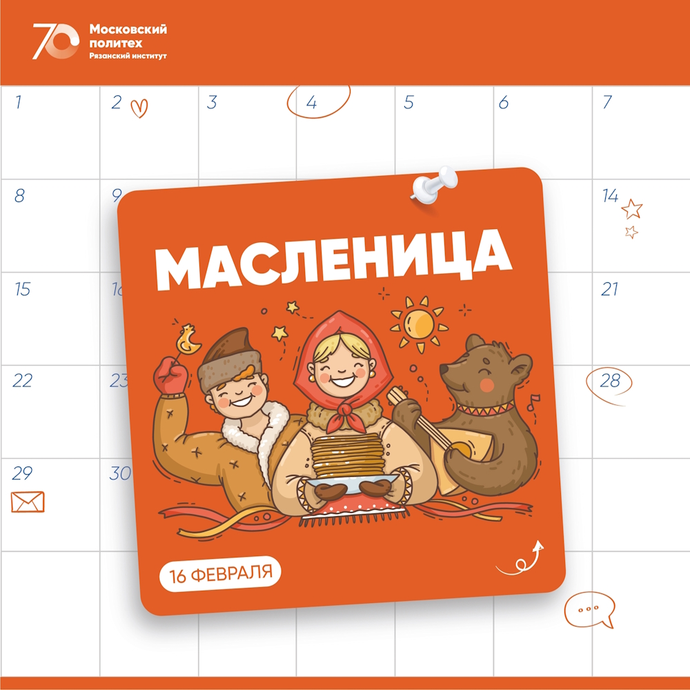 Коллектив Рязанского политехнического института поздравляет студентов, преподавателей и сотрудников с началом Масленичной недели. Этот праздник знаменует проводы зимы и ожидание весны, являясь важной частью культурных традиций.