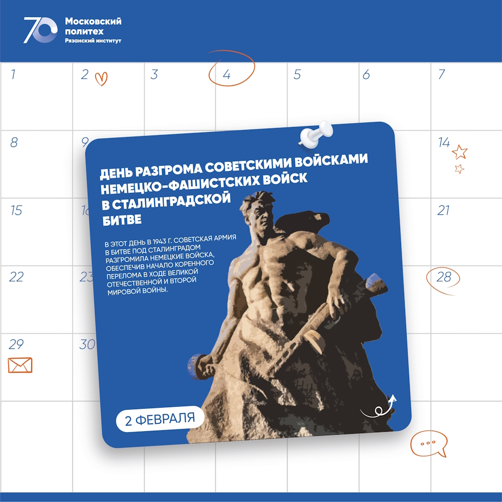 2 февраля в Российской Федерации отмечается День разгрома советскими войсками немецко-фашистских войск в Сталинградской битве. Эта памятная дата установлена Федеральным законом “О днях воинской славы (победных днях) России” в честь одного из решающих событий Великой Отечественной войны.