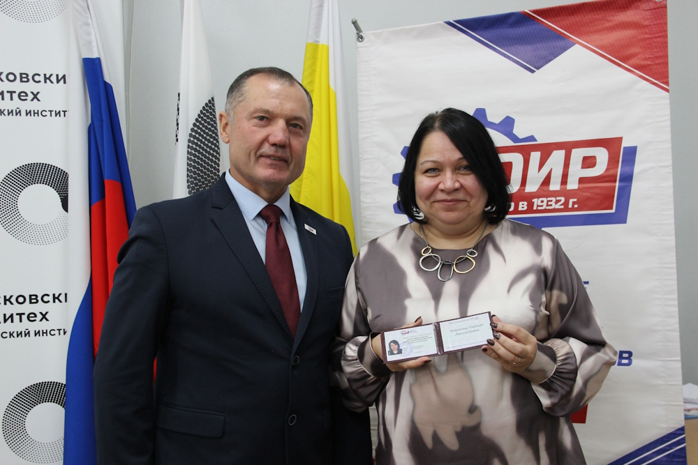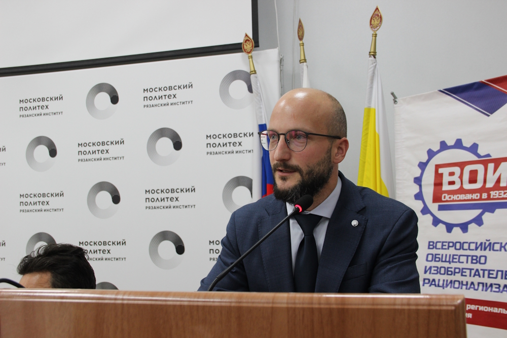 Также Игорь Александрович вручил удостоверения новым членам Всероссийского общества изобретателей и рационализаторов: Надежде Александровне Антоненко, заведующей кафедрой “Промышленное и гражданское строительство”, Максиму Владимировичу Антоненко, доценту кафедры ПГС, Антону Владимировичу Байдову, доценту кафедры ПГС, и Николаю Викторовичу Шешеневу, доценту кафедры ПГС. После приветственное слово произнес заместитель начальника управления промышленной политики и инновационного развития министерства экономического развития Рязанской области Артём Вячеславович Дубцов.