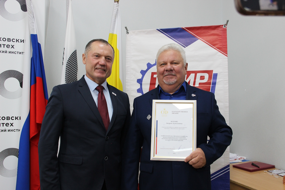 В рамках круглого стола Игорь Александрович наградил благодарственным письмом Совета Федерации Федерального Собрания РФ старшего преподавателя Андрея Алексеевича Котова за многолетний труд, преданность профессии, значительный вклад в дело подготовки высококвалифицированных специалистов и в связи с юбилеем. Также Почётной грамотой Рязанского отделения ВОИР были награждены: Алексей Сергеевич Антошкин, Андрей Игоревич Даньков, Сергей Сергеевич Румянцев и Тамара Вячеславовна Юшкина.