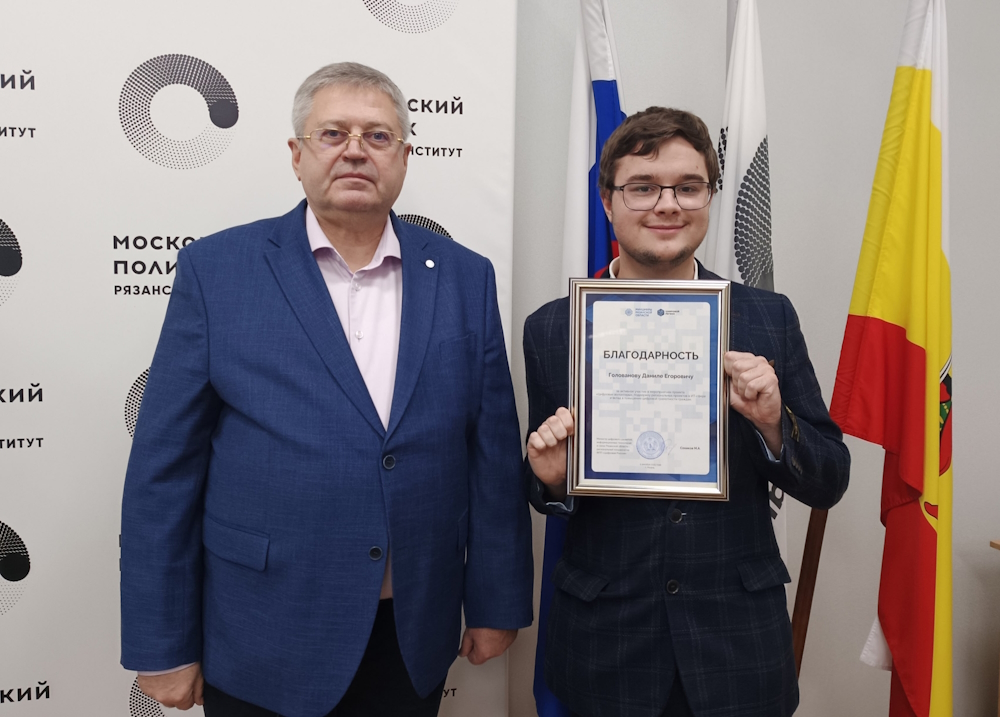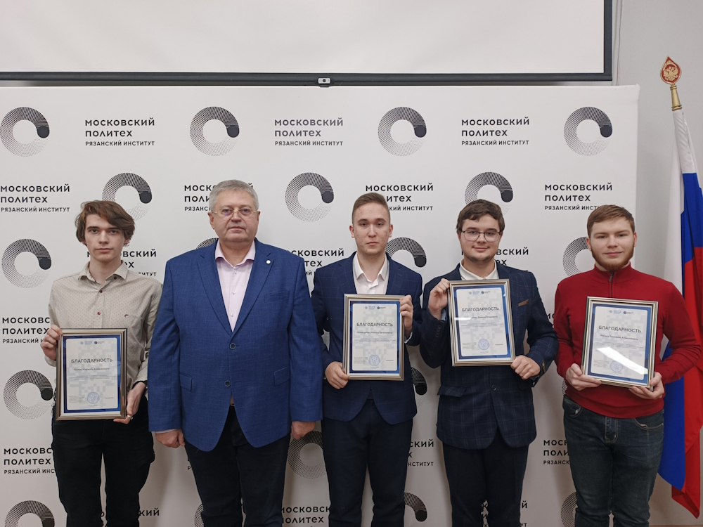 Студентам кафедры “Информатика и информационные технологии” Тимофею Росину, Кириллу Балогу, Роману Поликарпову и Даниле Голованову вручили Благодарности Министра цифрового развития, информационных технологий и связи Рязанской области М.А. Соникова.