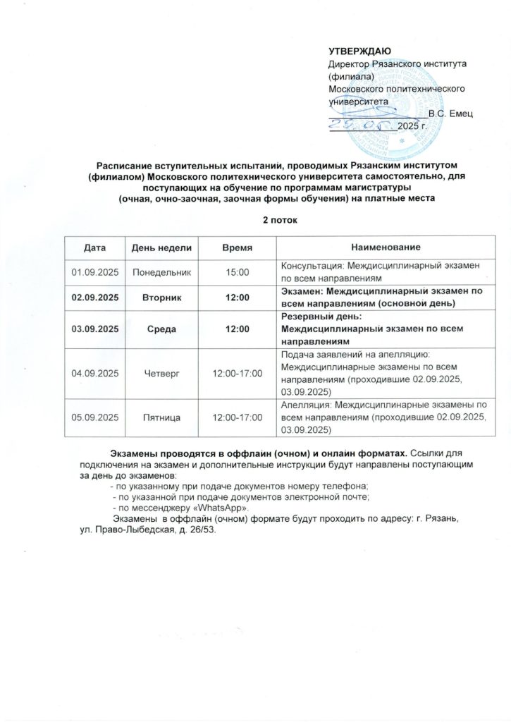 Напоминаем вам, что уже скоро начнется 2 поток внутренних вступительных испытаний для поступающих в магистратуру, проводимых Рязанским политехническим институтом самостоятельно. Прикрепляем актуальное расписание экзаменов.