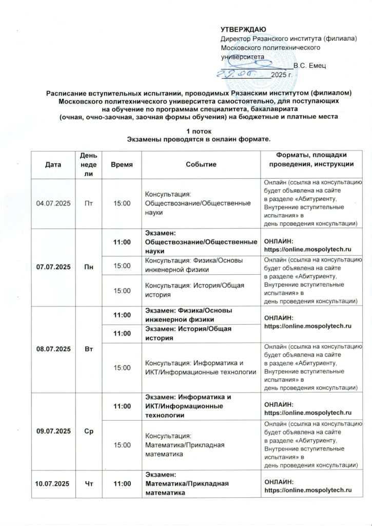 Уже вовсю идёт 1 поток внутренних вступительных испытаний, проводимых Рязанским политехническим институтом самостоятельно. Для вашего удобства дублируем актуальное расписание экзаменов для будущих бакалавров и специалистов нашего института с сайта вуза.