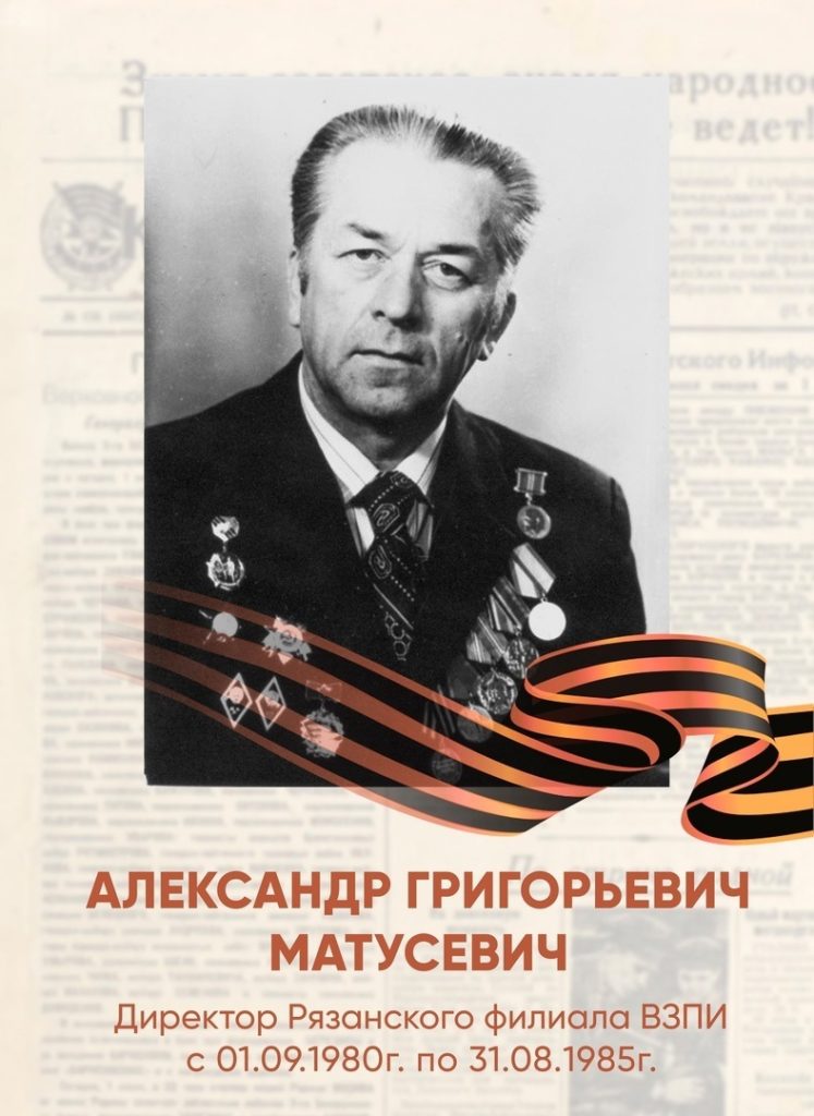 В Рязанском Политехе продолжается акция “Мы помним”. Завершает череду рассказов о фронтовиках-руководителях Рязанского Политеха история боевого пути Александра Григорьевича Матусевича, который возглавлял вуз с 01.09.1980. по 31.08.1985.