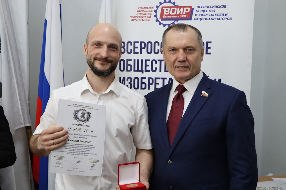 Церемония награждения стала одним из ключевых моментов встречи. Председатель Рязанского отделения ВОИР, сенатор РФ Игорь Александрович Мурог и заместитель министра экономического развития Рязанской области Галина Глебовна Крутова вручили награды XXIX-го международного Салона изобретений и инновационных технологий “Архимед”.